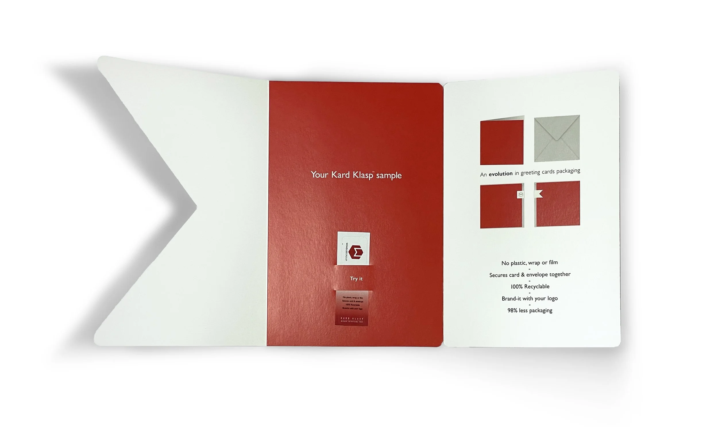 Kard Klasp is the revolutionary new way to present your greetings card ranges. No plastic, no film and no wrap, ensuring your product is 100% recyclable. Developed by the Windles Group, this mechanism keeps your card with the envelope securely, until the card is purchased, at which point the customer simply removes the easy-peel, recyclable seal.